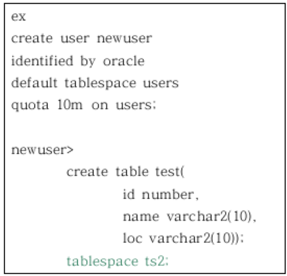 ㄴ-> tablespace ts2 는 users가 아닌 ts2를 테이블 스페이스로 사용하고자 할때 지정한다.