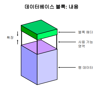 - 블록 헤더에는 세그먼트 유형, 데이터 블록 주소, 테이블 디렉토리, 행 디렉토리, 블록의 행을 수정할 때 사용되는 각각 약 23바이트인 트랙잭션 슬롯이 포함된다. 블록 헤더는 맨 위부터 아래쪽으로 확장된다.