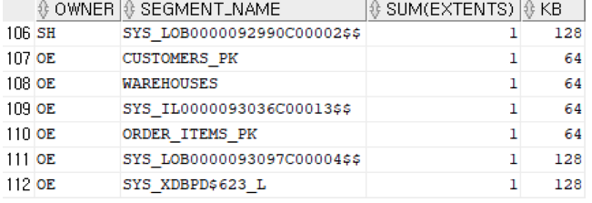 SQL> select owner, segment_name, sum(extents), sum(bytes) /1024 kb
