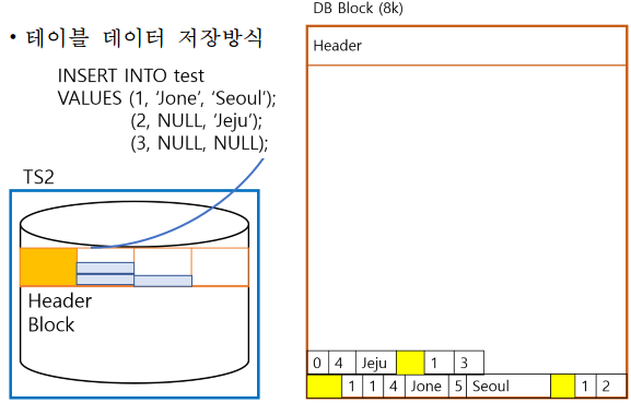 - 테이블 생성시 미리 정의된 용량만큼 테이블 스페이스가 생성되고 거기에 데이터를 저장한다.