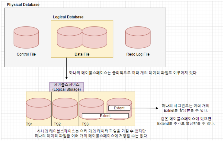 - 한 테이블 스페이스가 1 데이터 파일을 가질 수 있음