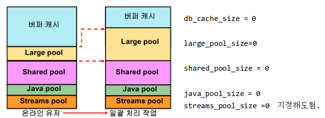- Large pool 을 많이 사용하는 것이라면 자동으로 Large Pool 사이즈를 줄이고 다른 컴포넌트가 줄어들게 된 다.