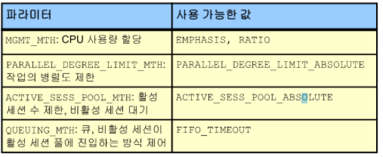 - cpu할당방식, active session pool 리소스 할당, 병렬도 리소스 할당, 큐 대기 리소스 할당 방식 지정