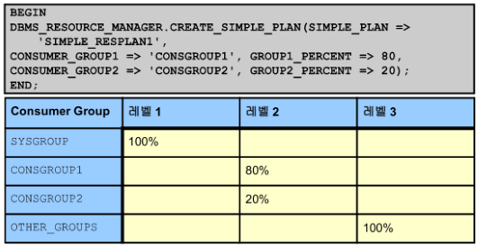 DBMS_RESOURCE_MANAGER.CREATE_SIMPLE_PLAN 을 사용하여 단순 리소스 플랜 생성가능.